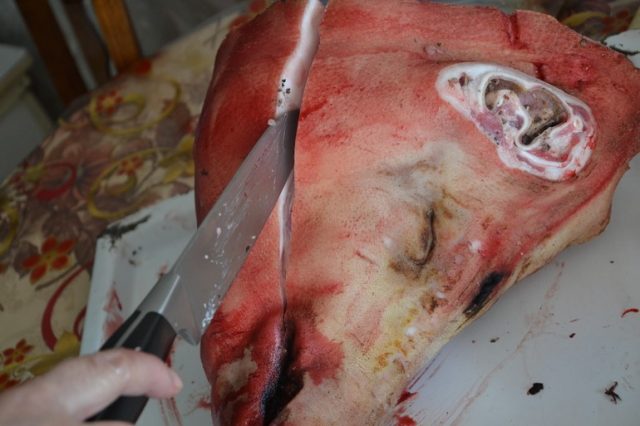 - El cap es col·loca en una caseta de troncs de la taula, després de la qual es treu la carn de la part frontal. Aquesta carn es pot utilitzar per a carn picada en combinació amb altres parts de la canal de porc (espatlla o coll).