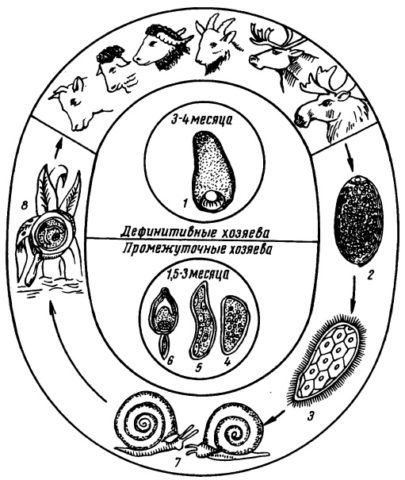 Els ous dels helmints són força grans, rodons, de color gris. Alliberat al medi ambient amb femta animal. A una temperatura confortable per a ells (19-28 ° C), un meracidi (larva) surt dels ous en un parell de setmanes. Entra al cos del mol·lusc de roca de la closca, formant redia materna al fetge. Després de 10-12 dies, es formen redia filla a partir d’elles, en què es desenvolupen cercàries. Romanen al cos de l’hoste intermedi fins a 3 mesos. Després surten a l’exterior, s’uneixen a l’herba i es tornen infecciosos per al bestiar. Després d’haver estat empassats pels animals, l’adolexària s’allibera dels quists i s’introdueix a les mucoses, fixant-se a les vellositats.