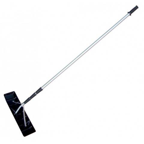 Un raspador ajudarà a eliminar la neu del sostre inclinat. Els models de fàbrica estan equipats amb un mànec telescòpic d'alumini. La seva longitud en estat desplegat arriba a més de 6 m. Tenint en compte l’alçada d’una persona, aquest rascador pot agafar un barret de neu des d’una alçada de fins a 8 m. Una característica especial del rascador és la part de treball de plàstic. No és un marc, sinó un element rectangular sòlid. Amb aquest rascador comencen a netejar la neu del terrat de baix a dalt. Els moviments es fan cap a ells mateixos, en lloc d’empènyer-se cap endavant, com és el cas d’un rascador de marcs.