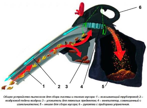 - Aspiració d'aire a través d'un broquet. Bàsicament, és una aspiradora. Les fulles, l'herba i altres objectes lleugers s'extreuen a través del broc, després del qual tot s'acumula a la paperera.