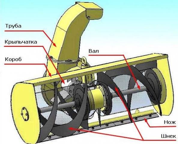 Una característica del dispositiu d’aparell de llevaneus és la presència d’un rotor o barrina. Els models combinats tenen els dos nodes. El rotor és un rotor amb pales que giren sobre els coixinets dins d’una carcassa d’acer. És fàcil de fer. És més difícil de fer pels bufadors de neu cargol... Aquí cal desenvolupar dibuixos.