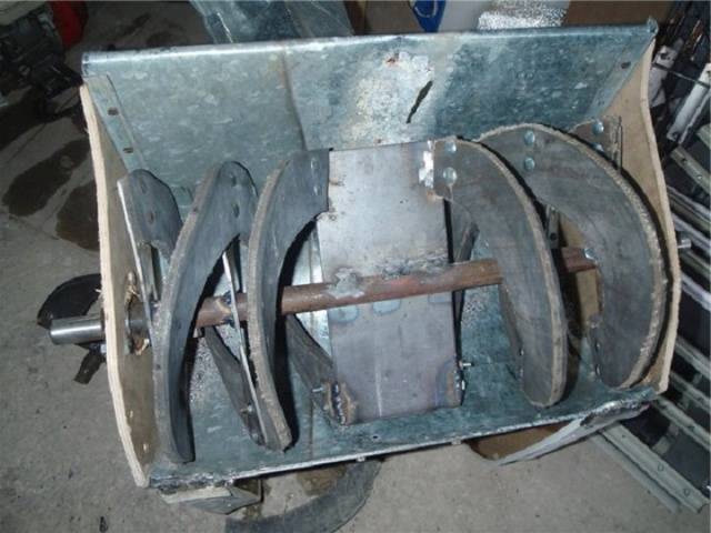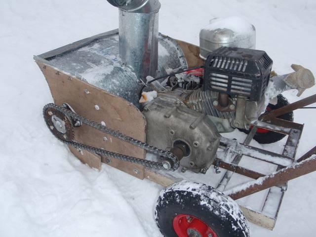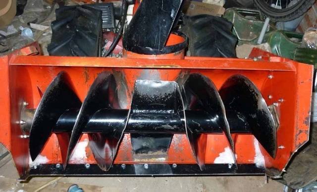 Per al cos del cargol, es talla una part del canó metàl·lic des del costat inferior amb una alçada de 150 mm. Es talla un forat al costat, on es solda un tub de derivació per subjectar la màniga. Es fa un forat al centre de la part inferior, s’insereix l’eix del rotor de manera que quedi dins de la voluta. S'hi posa un impulsor. Els cubs del coixinet del rotor estan cargolats a la part inferior del canó des de l'exterior de la voluta. Dues làmines rectangulars estan soldades des de la part frontal de la caixa. Les paletes agafaran la neu i el ventilador aspirarà, triturarà i llançarà.