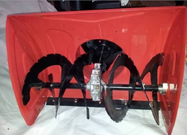 - El bufador de neu amb barres rotatives es pot equipar amb una caixa de canvis. S'instal·la en lloc de les fulles i l'eix del cargol està format per dues meitats.