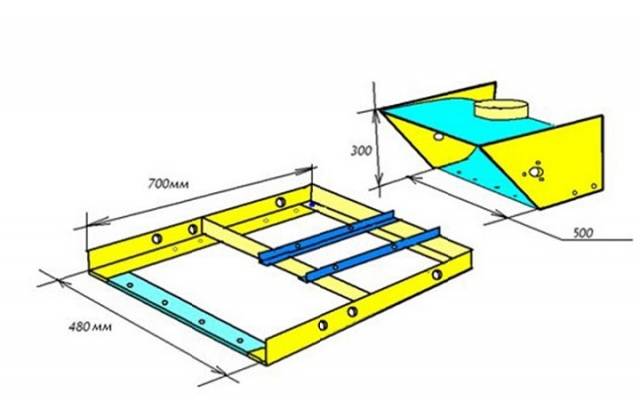 La galleda de neu està feta amb xapa d’acer. Per fer-ho, agafeu una tira amb una amplada de 500 mm i doblegueu-la amb un arc de 300 mm de diàmetre. Els costats es poden cosir amb fusta contraxapada o metall. Es talla un forat amb un diàmetre de 160 mm al centre de la part superior del receptor de neu, al qual s’uneix una màniga per expulsar la neu. L'estructura acabada s'instal·la al marc. Es solda a partir de cantonades metàl·liques.