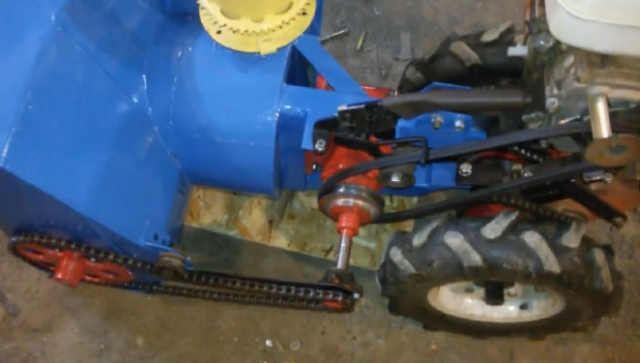 - Si a bufador de neu casolà muntat amb les vostres pròpies mans com a broquet per a un tractor a peu, podeu fer una conducció combinada. En aquest cas, l’eix del motor està connectat a l’engranatge intermedi mitjançant una transmissió per corretja i el parell motor de l’eix de l’engranatge a la barrena es transmet mitjançant una transmissió per cadena. El principi d'aquesta connexió es mostra a la foto.