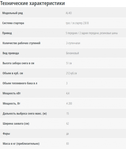 L’AL-KO Snowline 560 II té un rendiment similar al d’Al-KO Snowline 620E II, però una mica menys potent. No disposa d’un arrencador elèctric i l’amplada de l’adherència de la barrena és de només 56 cm. Val la pena assenyalar que aquesta amplada és suficient per netejar els senders. La presència d’engranatges de marxa enrere i endavant, així com de rodes transitable, fan que el cotxe de gasolina sigui extremadament manejable. El cost d’aquest equip és de 53-56 mil rubles. Podeu trobar més informació sobre les seves característiques a la taula: