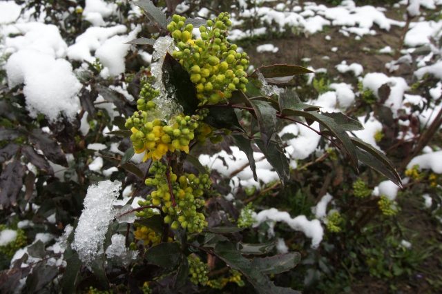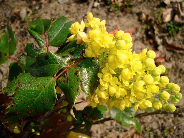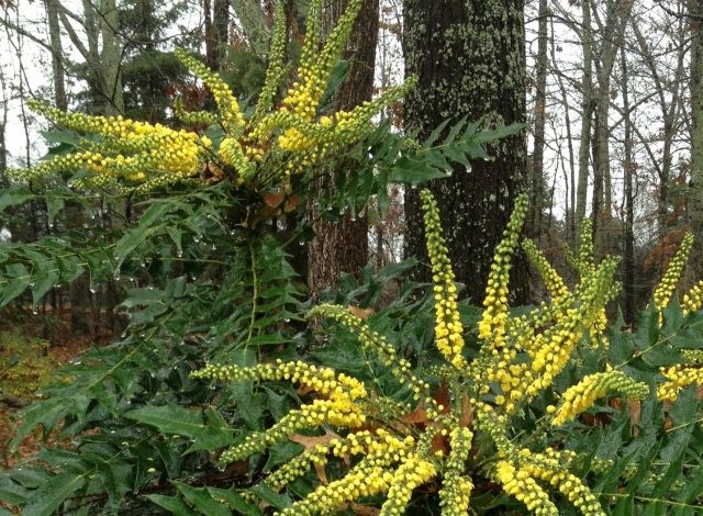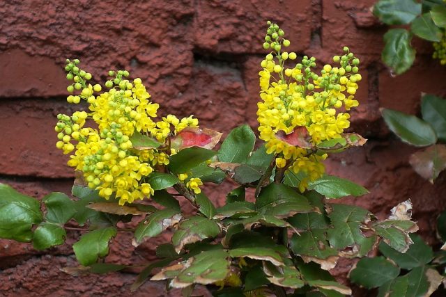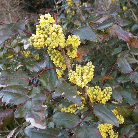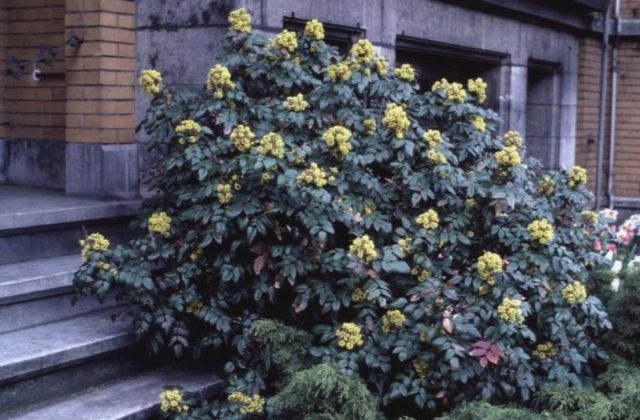 La foto mostra el grèvol de Mahonia durant la floració, la cultura és atractiva per al disseny de paisatges durant tot l'any. El color de les fulles a l’hivern adquireix un color vermell fosc, té un aspecte estètic agradable sobre el fons de la neu, serveix d’accent brillant al jardí “dormit”. La planta floreix des de principis d'abril fins a maig. El cultiu està completament cobert de grans inflorescències amb flors grogues brillants, petites i perfumades. La magonia es compara favorablement amb els arbustos florits per l’abundància i la durada de la floració.