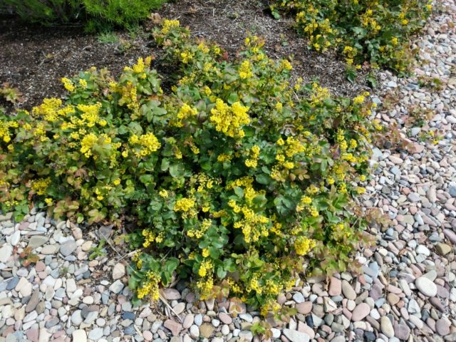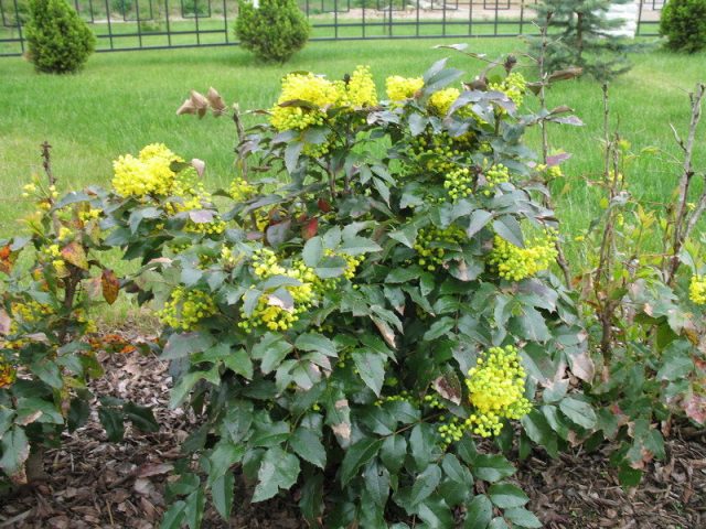 El grèvol de Mahonia pertany a l’espècie Barberry. L’arbust creix lentament, als 6 anys, l’alçada varia d’1 a 1,3 m, l’indicador depèn de la zona climàtica. La planta ha guanyat la seva popularitat a causa de la seva resistència a la sequera, la seva poca pretensió per la composició del sòl i la tolerància a l’ombra. No perd el seu hàbit decoratiu a l'ombra parcial. Si el grèvol mahonia es troba sota la densa corona d’arbres de gran creixement, el color de les fulles és més pàl·lid que a la zona oberta a la radiació ultraviolada.