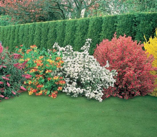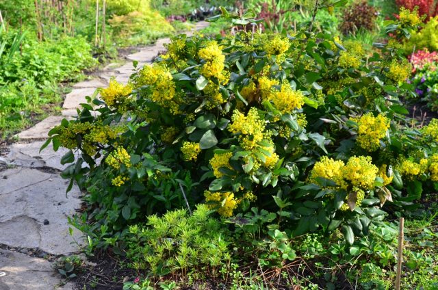 Els arbustos tenen diferents termes i durades de floració, diferent color de les fulles. Els requisits de cura i temps de poda són els mateixos. La foto mostra un exemple de l’ús de la mahonia de grèvol en la composició en el disseny de paisatges.
