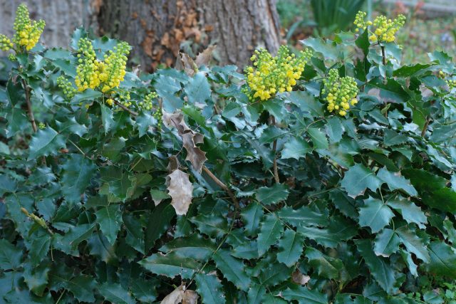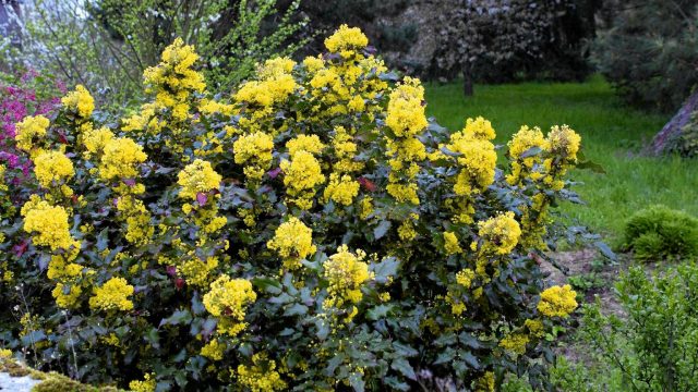 A la primavera, Mahonia es combina harmoniosament amb plantes de floració primerenca: