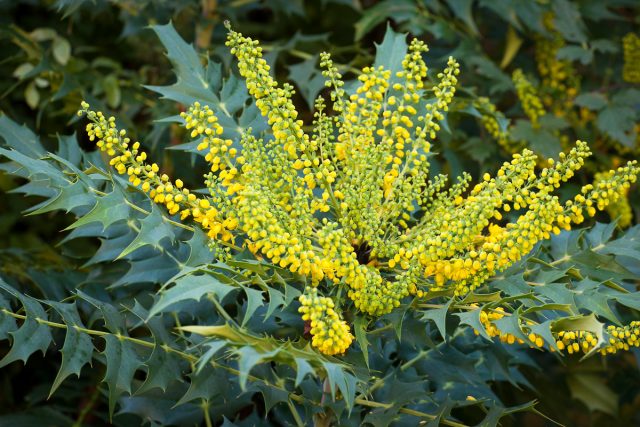A l’estiu, el grèvol de Mahonia dóna color a una composició amb flors baixes i més altes: