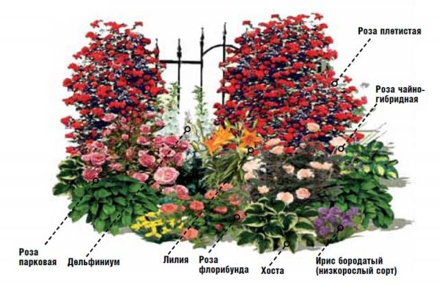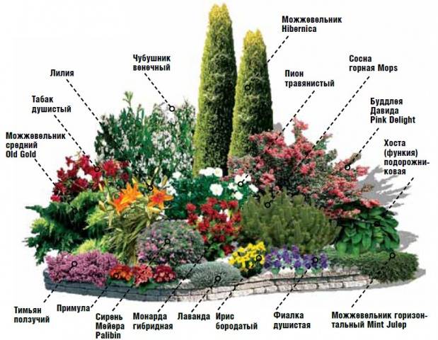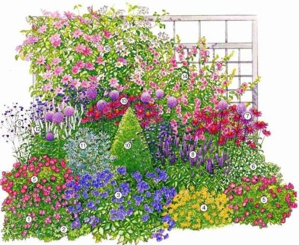 El disseny d’un llit de flors es basa en el fet que es planten plantes baixes (la seva alçada no supera els 40 centímetres), les plantes mitjanes es planten darrere d’elles (no més de 60 centímetres) i les altes (una metre i superior) s’enfonsen al fons. No només es poden utilitzar arbusts i arbres com a plantes altes, sinó també plantes enfiladisses, per exemple, raïm donzell o clematis.