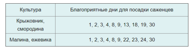 Si escolliu els dies més favorables segons el calendari, la plantació i el trasplantament es faran els dies 5, 6, 13, 18, 19, 20, 23, 24, 30. La lluna tindrà un bon efecte sobre el sòl. Els cultius de fruites i baies arrelaran ràpidament, sobreviuran a l’hivern glaçat, es despertaran a la primavera i començaran a créixer.