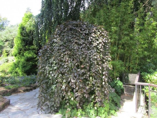 - Arriba a una alçada de 3 m, el tronc principal és gruixut, marró fosc, els brots joves són de color verd clar. La corona densa i de ràpid creixement s’assembla a un dosser i requereix una poda constant per mantenir la seva forma.