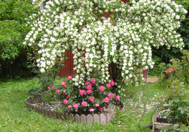 A més, en disseny de paisatges, el gessamí del jardí s’utilitza per decorar carrerons o decorar un jardí temàtic, així com per a un patró geomètric simètric en una àrea específica d’una parcel·la personal. Si seguiu totes les mesures recomanades a l’hora de plantar i cuidar un arbust, un chubushnik envoltat d’altres cultius florals tindrà el mateix aspecte que a la foto.