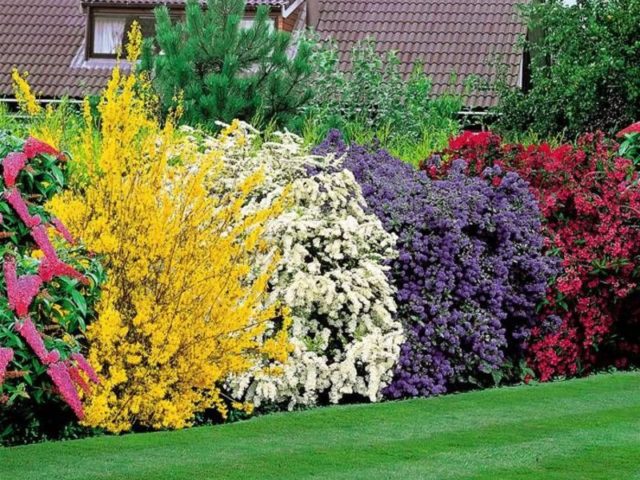 A la foto de la composició pintoresca, hi ha un arbust amb altres plantes amb flors que coincideixen en termes de descripció, condicions de cultiu i regles de plantació.