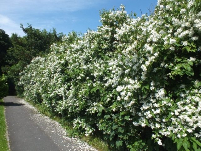 Per crear vorades baixes al jardí o en altres zones, per exemple, com a la foto, les varietats de mida taronja fals són perfectes. Varietats com Moonlight, Akademik Komarov, White Bouquet i altres no necessiten un tall de cabell i són ideals per a bardisses baixes.