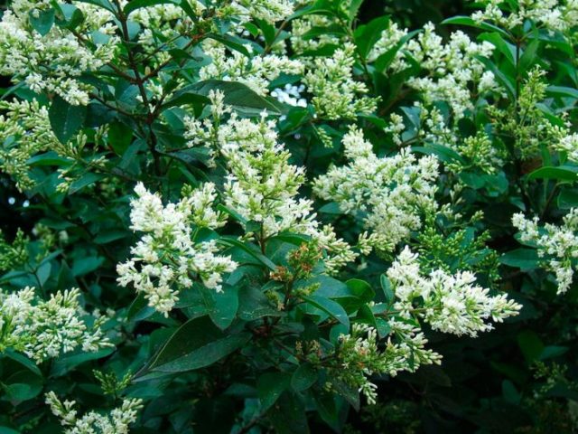 El color del fullatge a l’estiu és de color verd fosc, a la tardor es converteix en un ric porpra. El ligustro de fulla apagada floreix al juliol i la floració és força abundant. Les flors de l’arbust són petites, fins a 1 cm de diàmetre. Es recullen en panícules denses i netes d’uns 4-5 cm de llarg i fins a 3 cm d’amplada.El color dels pètals és blanc amb notes cremoses.