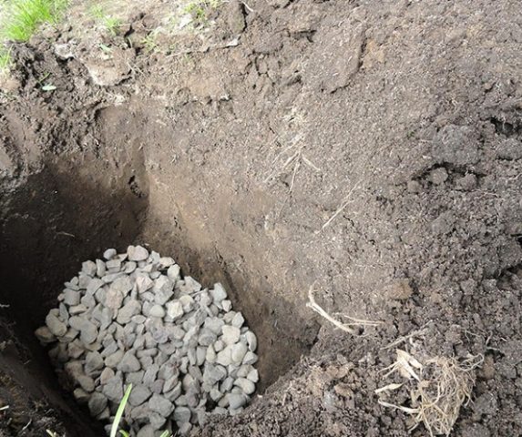 - Després que l'aigua hagi entrat completament al sòl, el fons del forat s'escampa amb una capa de drenatge. Com a drenatge s’utilitzen trossos de maó, grava, còdols i fragments d’argila trencats. El gruix òptim de la capa és de 15-20 cm.