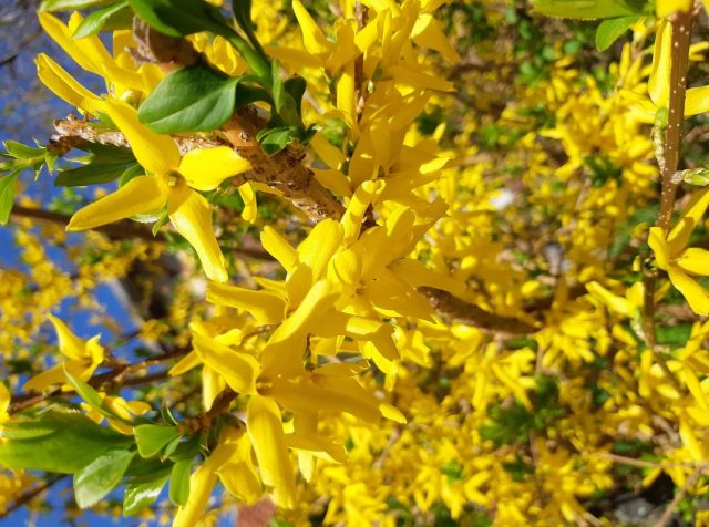 A la primavera, s’examina forsythia per trobar branques danyades per les gelades. Si n’hi ha, s’han d’eliminar. S’ha de prestar especial atenció a les puntes, si estan danyades, es tallen.