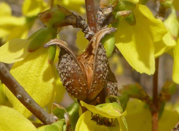 Tot i que la forsítia és resistent a plagues i malalties, hi ha la possibilitat que aparegui un fong. Amb una malaltia per fongs, apareixen petits creixements a l’arbust, que s’assemblen a les berrugues. Com que aquesta malaltia és pràcticament incurable, s’ha d’eliminar completament l’arbust i plantar-ne una altra.