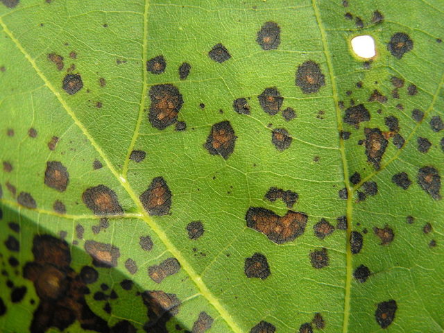 Al principi, les fulles de la liana pecíol estan cobertes de taques grogues i, a continuació, es tornen marrons per fora i adquireixen un color morat per dins.