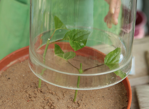 Abans d’arrelar, els esqueixos s’han de col·locar en mini-hivernacles, embolicant el recipient amb ells en una bossa de plàstic o cobrint-los amb una ampolla de plàstic