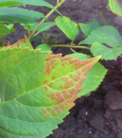 - Rovell - acompanyat d’una floració vermella a les fulles i inflorescències d’hortènsies. La raó pot ser una plantació massa propera de plantes o un excés de nitrogen al sòl. Per al tractament, utilitzeu fàrmacs de coure o fungicides ("Topazi", "Falcó", etc.).