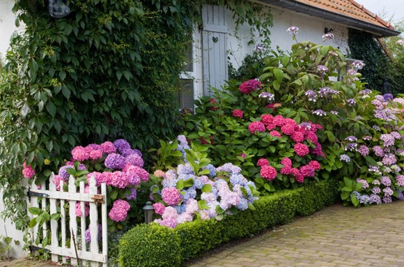 També es veu molt bé en combinació amb altres plantes. Els parterres, formats per hortènsies multicolors de diferents varietats, tenen un aspecte molt bonic.