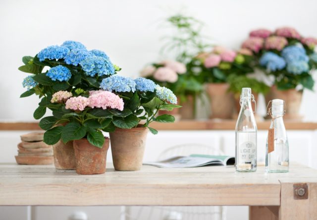 A l’ampit de la finestra, les plantes tenen un període de floració més llarg que al carrer. Les hortènsies interiors floreixen de maig a finals de tardor.