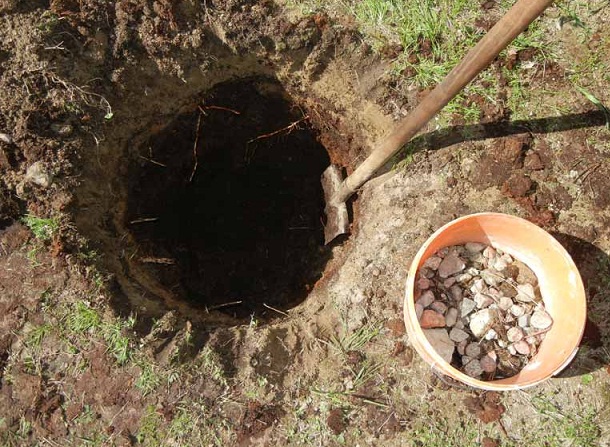 - Immediatament abans de plantar les plantes, es col·loca una capa de drenatge de maó trencat o pedra triturada al fons de les fosses de plantació i s’escampa amb fertilitzants minerals amb un alt contingut de nitrogen, fòsfor i potassi.
