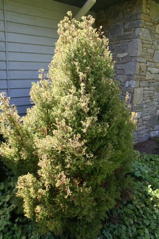 El xiprer (Chamaecyparis Thyoides) pertany a la família dels xiprers. Exteriorment, sembla un xiprer, però té branques curtes i planes. El xiprer de Thuyu s’assembla al thuyu amb la seva forma cònica. Aquest arbre de coníferes de fulla perenne, originari d’Amèrica del Nord, arriba als 20-25 m en el seu entorn natural, i a Europa es conrea més sovint les seves espècies nanes.