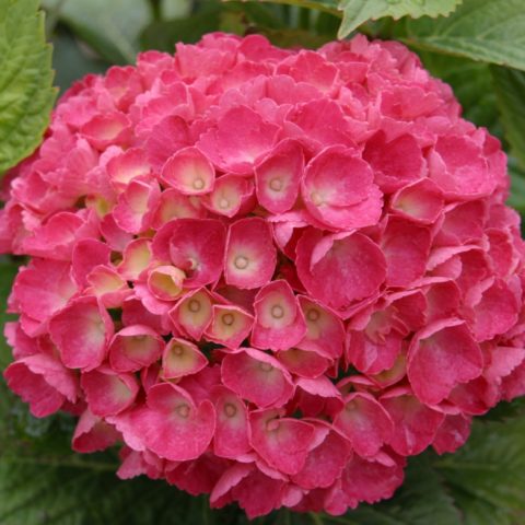 Els casquets d'inflorescència són grans, fins a 25 cm de diàmetre. Les flors són de color rosat-carmesí amb un centre de color verd pàl·lid. La coloració depèn en gran mesura de l’acidesa del sòl sobre el qual es cultiva la flor.