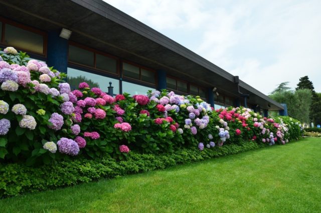Molt sovint es planten prop de l'entrada de l'edifici o al llarg de les seves parets. Una hortènsia vermella al centre d’una gespa ben cuidada quedarà bonica. Sovint es planten arbustos baixos en testos al costat d’objectes arquitectònics i estàtues sobre pedestals.