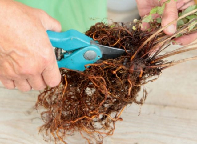 - Divisió del matoll. A principis de primavera i després de la floració, es poden dividir arbustos madurs de hortènsies vermelles de fulla gran en parts. Per fer-ho, s’extreuen del terra i es tallen o es divideixen en diverses divisions, mentre que cadascuna d’elles ha de tenir brots amb arrels. Després de dividir-se, part de l’arbust s’ha d’arrelar immediatament en un lloc nou.