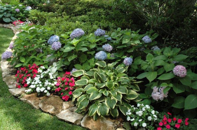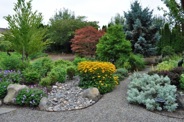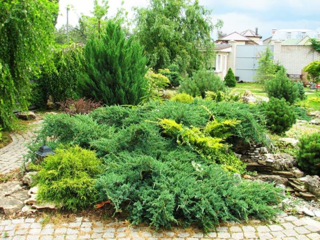 - Jardins de roca. Molt sovint, les composicions estan decorades amb pedres de diversos tipus i mides. Les verdes de coníferes es planten al territori dels jardins de roca. Els arbustos de Potentilla es poden convertir en una illa, que amb flors grans i brillants diluirà el color verd predominant del fullatge de tota la composició;
