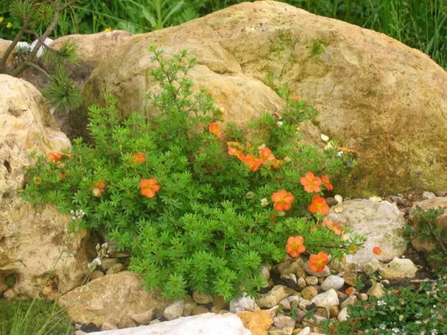 Arbust Potentilla és perfecte per créixer en graons rocosos: en nombroses fotos de disseny de paisatges es pot veure com els arbusts esfèrics de flors grans canvien significativament el seu aspecte general durant la floració.