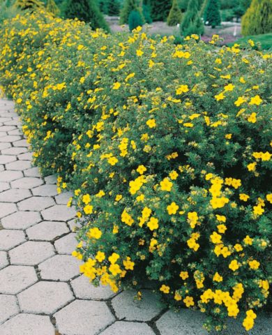 La planta respon amb calma a la formació de la corona, l'estructura de l'arbust permet crear qualsevol forma, segons la decisió de disseny. Després de podar durant tota la temporada, conserva el seu efecte decoratiu i no requereix remodelació. La foto mostra un exemple d’utilització de l’arbust Potentilla Goldstar com a tanca.