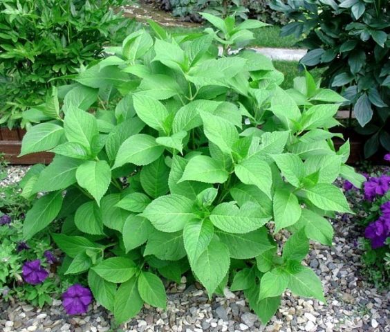 Hortènsia serrada, de fulla de roure, tallada espinosa mínimament (només les puntes dels brots vells). Una poda exhaustiva pot inhibir el creixement d’aquest tipus d’hortènsies.