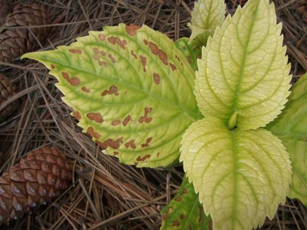 Malalties i plagues, per resistents que siguin les hortènsies, de tant en tant es superen. Parlant de fulles enrogides, especialment de taques marrons individuals, es pot assumir una malaltia fúngica. A més, el problema pot radicar en el fet que el sòl en què creix l’arbust està esgotat, està massa assecat o està massa ple.