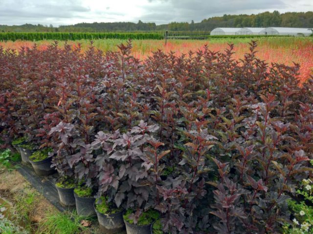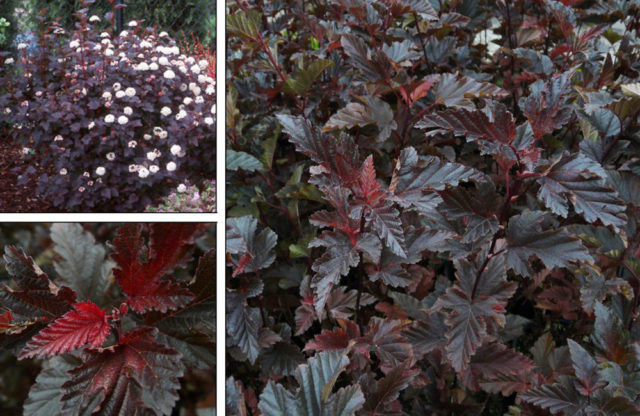 Fulles | 5-7 lobulats, de 7-10 cm de diàmetre, arrodonit-el·líptic, de color vermell fosc, que es converteix en bronze a la tardor, fullatge verd a l’ombra, amb un to vermellós |