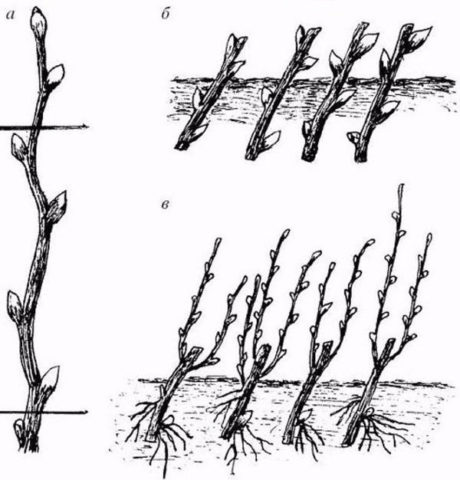 Aquest procediment es realitza a principis de primavera, de manera que les capes arrelen abans de l’inici de l’hivern. Per al tall, es tria un brot sa i fort que creix cap a l'exterior. Traieu totes les fulles excepte les de la part superior. El brot es col·loca en un forat de 15 cm de profunditat i es fixa al terra amb un suport de fusta.