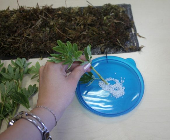 Els talls tallats s’alineen al llarg de la vora inferior i es lliguen amb cordill en feixos de 25 a 50 peces. La següent etapa de preparació és el tractament dels esqueixos amb estimulants del creixement que contribueixen al desenvolupament ràpid d’un poderós sistema radicular. Hi ha solucions estimulants disponibles a botigues especialitzades. Abans d’utilitzar-los, heu d’estudiar detingudament les instruccions. Alguns medicaments són eficaços quan es dilueixen en aigua freda, d'altres necessiten aigua bullent o solució d'alcohol.