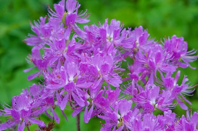 Corol·la de dos llavis de rododendró canadenc amb tres pètals de 2-2,5 cm de diàmetre. Està formada per parts estretes fortament separades, la qual cosa dóna la sensació d'una elegant i elegant gràcia de la flor. Els cabdells de 3-8 peces, ben recollits en inflorescències de 5-8 cm d’amplada, no fan olor. Els pètals són de color rosa-lila, formes híbrides amb diferents tons de rosa, blanc, crema. Nombrosos estams llargs donen esponjosa a la inflorescència de les espècies canadenques. El rododendre canadenc sense pretensions floreix a la segona dècada d'abril o principis de maig, quan les fulles encara no han florit. El roser crida l’atenció de tothom a principis de primavera. La floració dura fins a dues o tres setmanes.