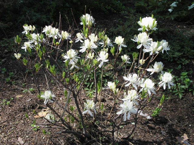El rododendre canadenc es planta com a tènia a la gespa, mentre que es col·loquen 3-4 arbusts en miniatura per obtenir un efecte més gran. La decoració d’una planta baixa s’assegurarà al llarg de la temporada càlida per les fulles de color gris blavós i, al maig, la floració de brots graciosos.