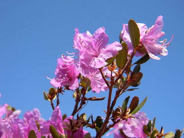 La floració de la varietat es produeix entre abril i maig, de vegades a l'agost o setembre, l'arbust torna a florir. A la foto d’un rododendre a Sibèria, podeu veure que les flors de la varietat Ledebour són grans i de color lila pàl·lid.
