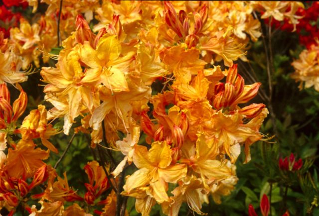 Una varietat de planta molt resistent a les gelades: Golden Lights, capaç de créixer fins a 2 m d’alçada i amb una corona àmplia i densa de fins a 1,5 m de diàmetre. Les fulles de la planta són allargades i bastant grans, fins a 10 cm de llarg i 6 cm d'ample. Poc abans de caure les fulles a la tardor, el rododendron Golden Lights adquireix un ric color carmesí, cosa que el fa molt decoratiu.