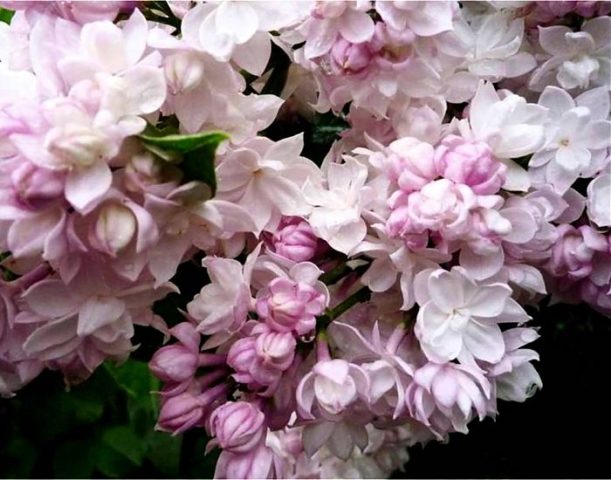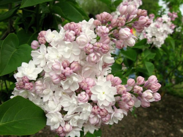 Lila comú La bellesa de Moscou pertany al primer grup de liles blanques. Les flors són blanques amb una floració lila visible i visible al centre, simètrica, de doble forma. La mida de la flor és de 2-2,5 cm Els pètals estan alçats, doblegats cap a l'interior.