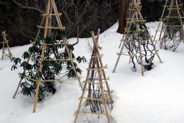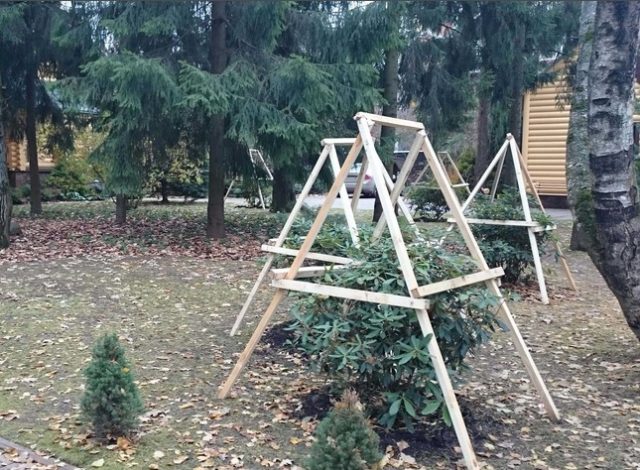 Els arbusts de rododendre s’estenen, quan cau molta neu a sobre del refugi, trencarà les branques, per la qual cosa és aconsellable construir un marc rígid. La forma de la base del marc ha de ser piramidal de manera que la neu baixi cap al terra. El marc s’instal·la a principis de tardor, quan el terra encara no està glaçat. Amb l’aparició del clima fred, s’estira un material protector des de dalt en 1-2 capes.