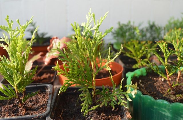 A la primavera, es poden plantar branques de tuia arrelades en un llit de jardí d'una escola per al seu posterior creixement. I al cap d’un any, es pot trasplantar un arbre jove de coníferes a un lloc permanent.